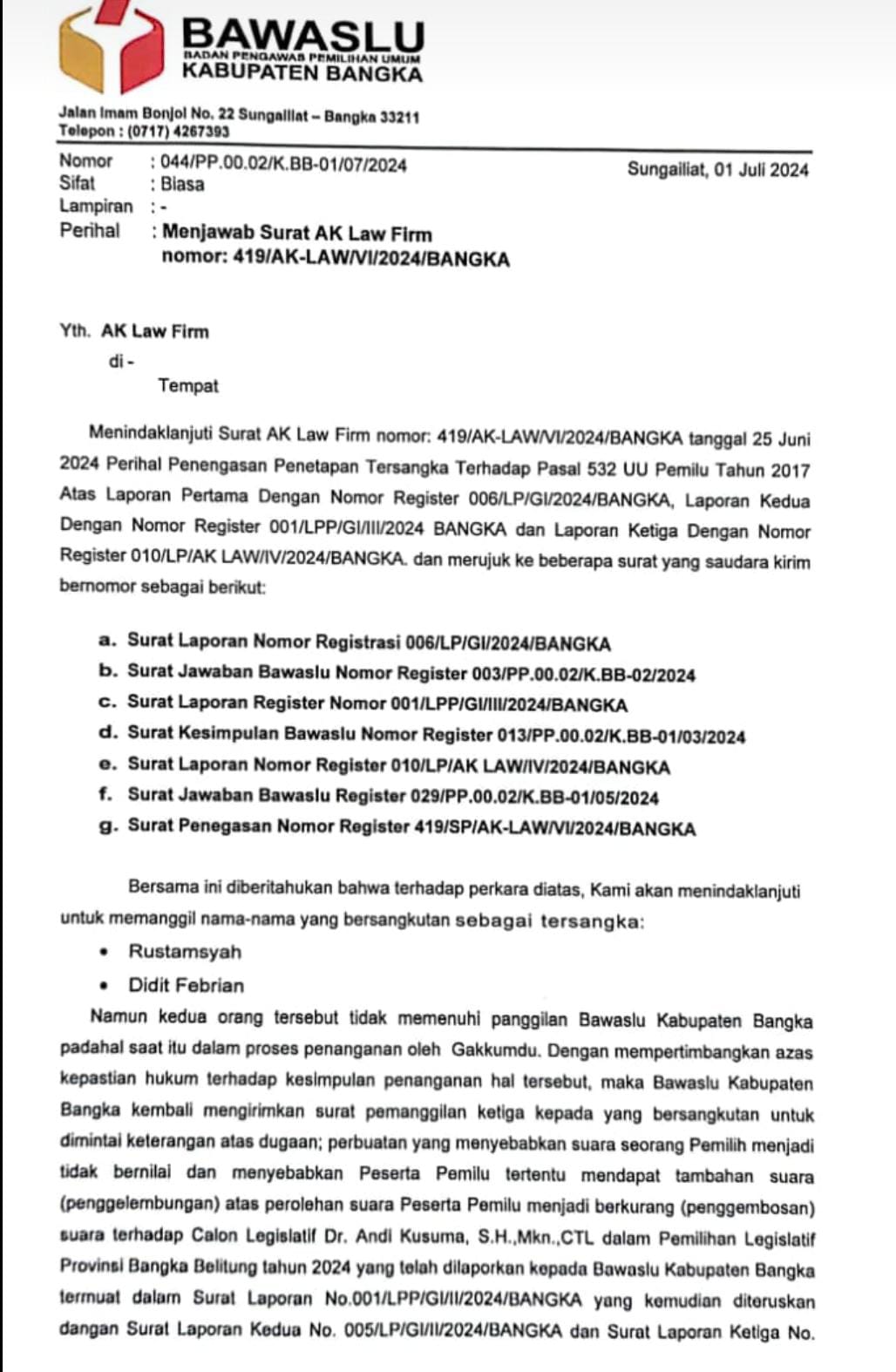 Dalam surat yang ditandatangani oleh Sugesti selaku Ketua Bawaslu Kabupaten Bangka tersebut, tak hanya menyebut nama Rustamsyah selaku tersangka yang dipanggil untuk diperiksa, namun ada nama lain yakni Didit Febrian, untuk memenuhi panggilan proses penegakan hukum oleh Gakumdu.