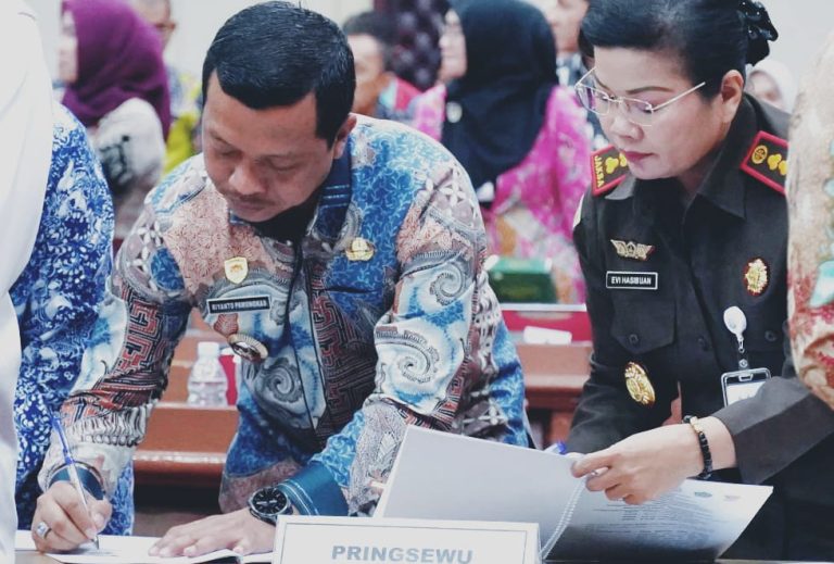 Bupati Pringsewu Riyanto Pamungkas dan Kepala Kejaksaan Negeri Pringsewu Evi Hasibuan menandatangani perjanjian kerjasama dalam rangka optimalisasi penanganan dan penyelesaian perkara berdasarkan keadilan restoratif serta pelaksanaan pidana kerja sosial bagi pelaku tindak pidana.