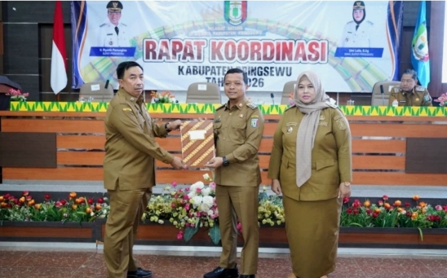 Bupati Pringsewu Riyanto Pamungkas menyerahkan Dokumen Pelaksanaan Anggaran (DPA) Organisasi Perangkat Daerah (OPD) Kabupaten Pringsewu Tahun 2026 kepada masing-masing Kepala OPD di lingkungan Pemerintah Kabupaten Pringsewu. DPA dibagikan pada saat Rapat Koordinasi (Rakor) Pemkab Pringsewu di Aula Utama Pemkab setempat, pada Senin (5/1/2026).