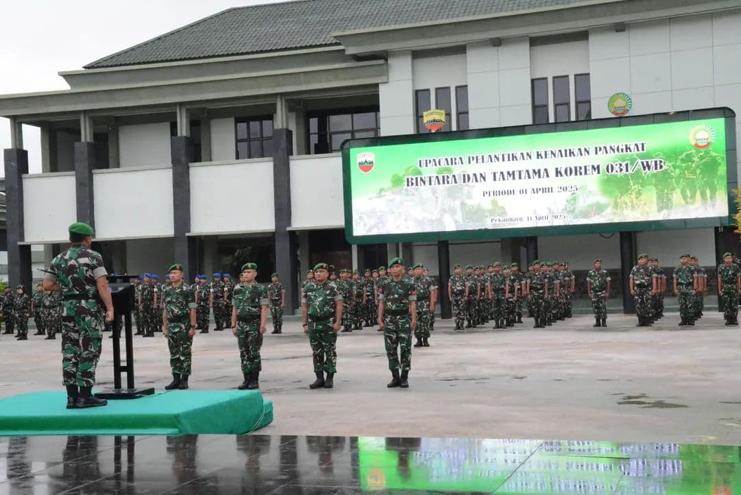 Pekanbaru, Metrozone.Net-Komandan Korem 031/Wira Bima, Brigjen TNI Sugiyono memimpin langsung upacara kenaikan pangkat bagi Bintara dan Tamtama di jajaran Korem 031/Wira Bima. Upacara yang berlangsung khidmat ini dihadiri oleh para prajurit beserta keluarga yang turut merasakan kebanggaan atas pencapaian yang diraih, bertempat di Lapangan Makorem Jl. Mayor Ali Rasyid.(11/04/2025)