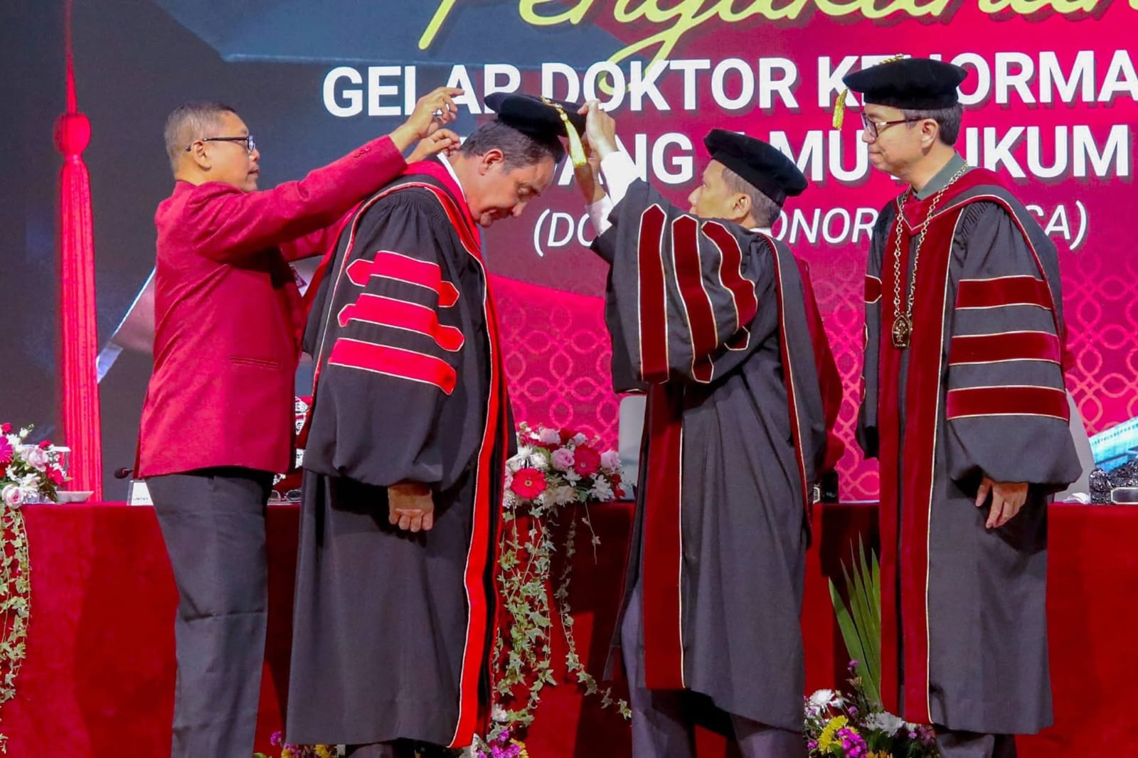 Penganugerahan gelar tersebut merupakan bentuk penghargaan akademik tertinggi atas kontribusi, pemikiran, dan pengabdian yang konsisten dalam pengembangan dan penegakan hukum, khususnya melalui penguatan kebijakan nasional serta praktik hukum yang berkeadilan dalam upaya Pencegahan dan Pemberantasan Penyalahgunaan dan Peredaran Gelap Narkotika (P4GN).