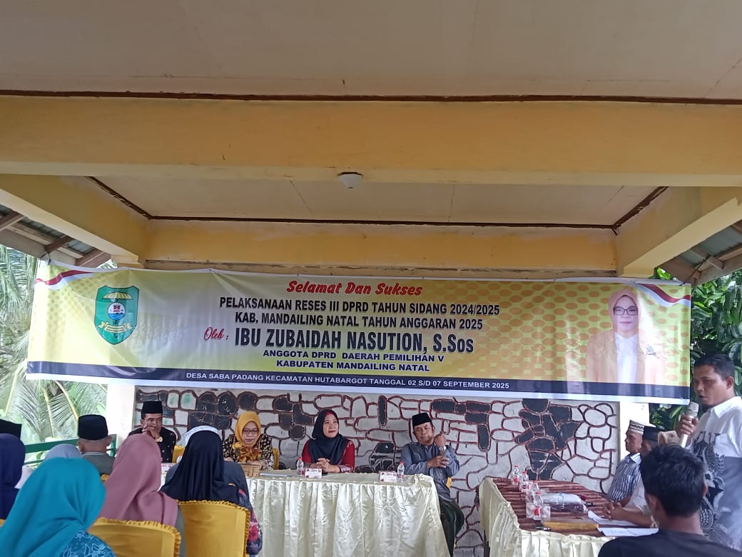 Anggota DPRD Kabupaten Mandailing Natal (Madina), Zubaidah Nasution, kembali menunjukkan konsistensinya dalam memperjuangkan aspirasi masyarakat di Daerah Pemilihan (Dapil) V. Kali ini, legislator dari Partai Golkar itu menggelar Reses III Masa Sidang 2024/2025 di Desa Saba Padang, Kecamatan Hutabargot, Kamis (04/09).