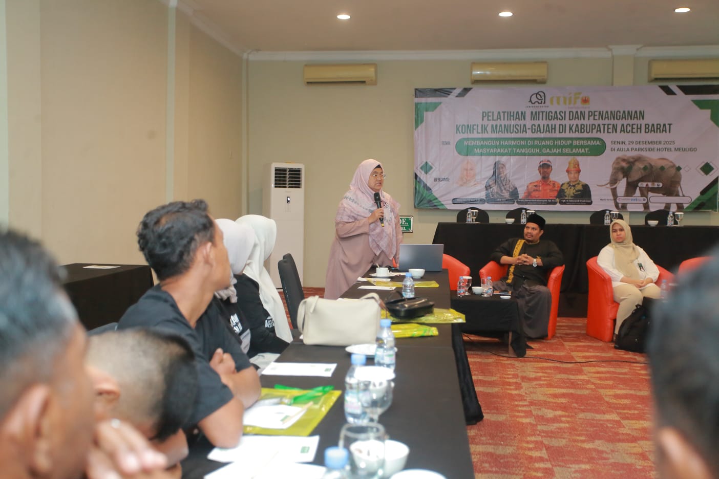 MEULABOH I METROZONE.net – Organisasi Jaringan Gajah Nusantara (JGN) Aceh menggelar pelatihan mitigasi dan penanganan konflik gajah–manusia, Senin (29/12/2025). Kegiatan yang disponsori PT Mifa Bersaudara ini diikuti oleh 25 peserta dari 11 gampong di Kecamatan Woyla Timur, Pante Ceureumen, dan Sungai Mas. Pelatihan berlangsung di Aula Parkside Meuligo Hotel, Meulaboh.