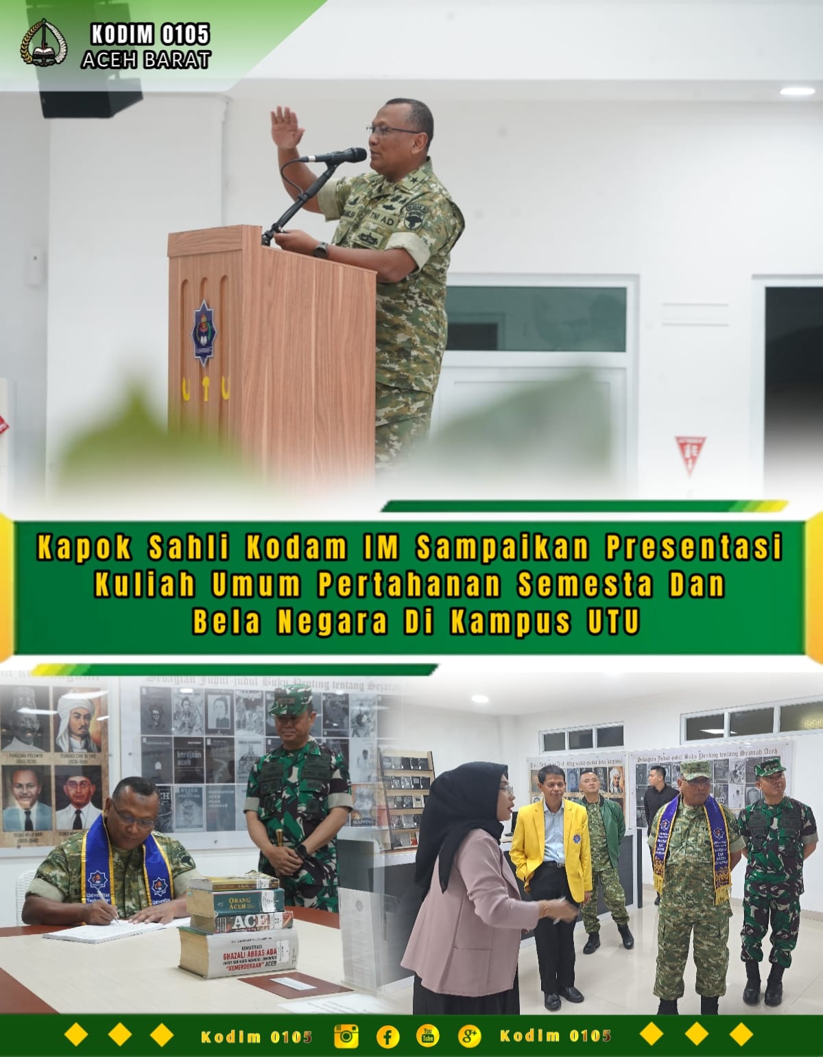 Aceh Barat (METROZONE.net) – Kapok Sahli Kodam IM Brigjen TNI Dr. Bambang Sulistyo Hery, S.Sos., M.Han., sampaikan presentasi Kuliah Umum pertahanan semesta dan bela negara di Aula Gedung Auditorium Universitas Teuku Umar (UTU) Jalan Alue Peunyaring Desa UTD Kecamatan Meureubo, Rabu (4/2/2026)