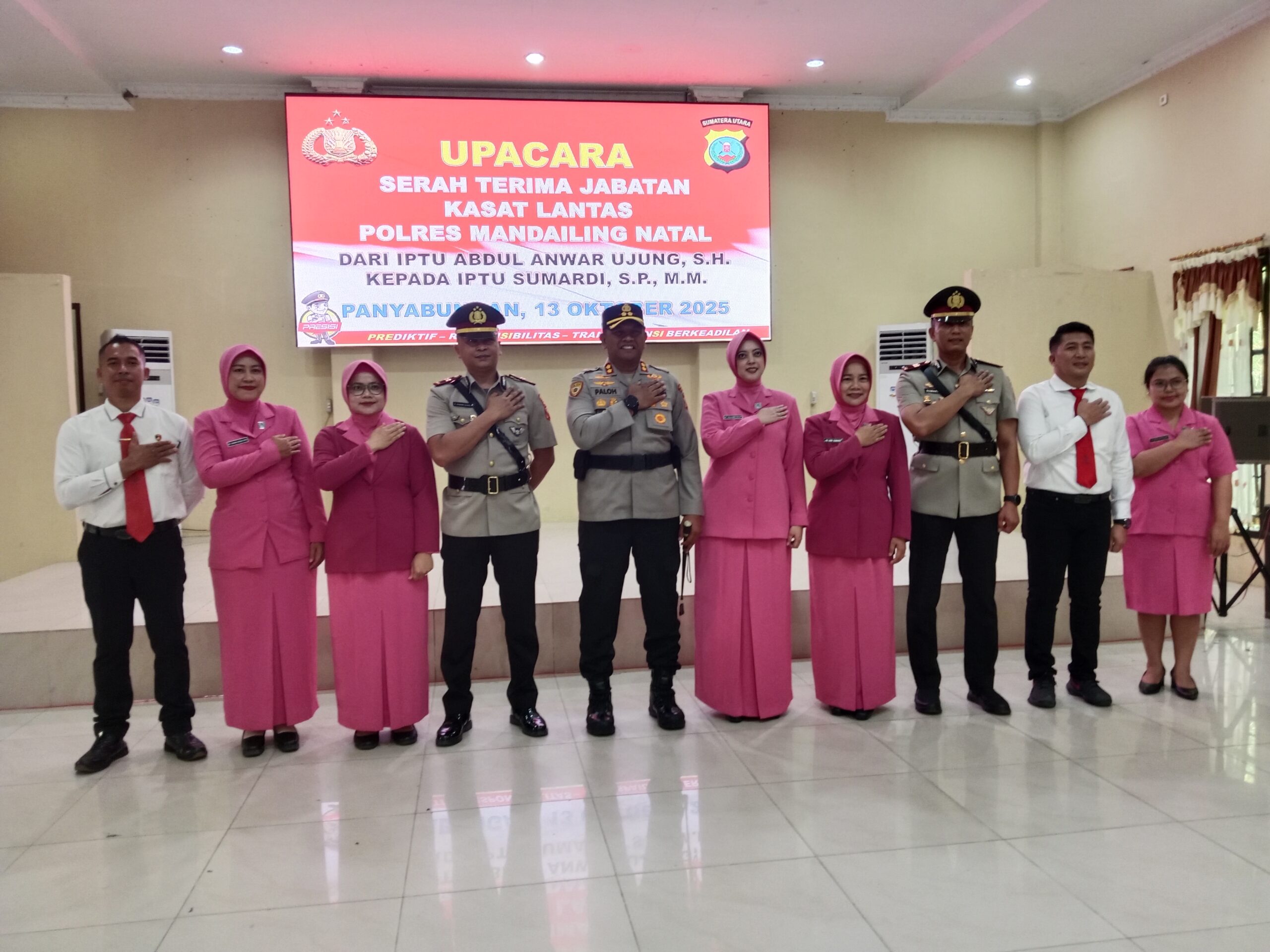 Dalam kegiatan tersebut, dilakukan serah terima jabatan Kasat Lantas Polres Madina dari IPTU Abdul Anwar Ujung, S.H., yang kini dipercaya mengemban tugas baru sebagai Paur BPKB Ditlantas Polda Sumut, kepada IPTU Sumardi, S.P., M.M., yang resmi menjabat sebagai Kasat Lantas Polres Mandailing Natal.