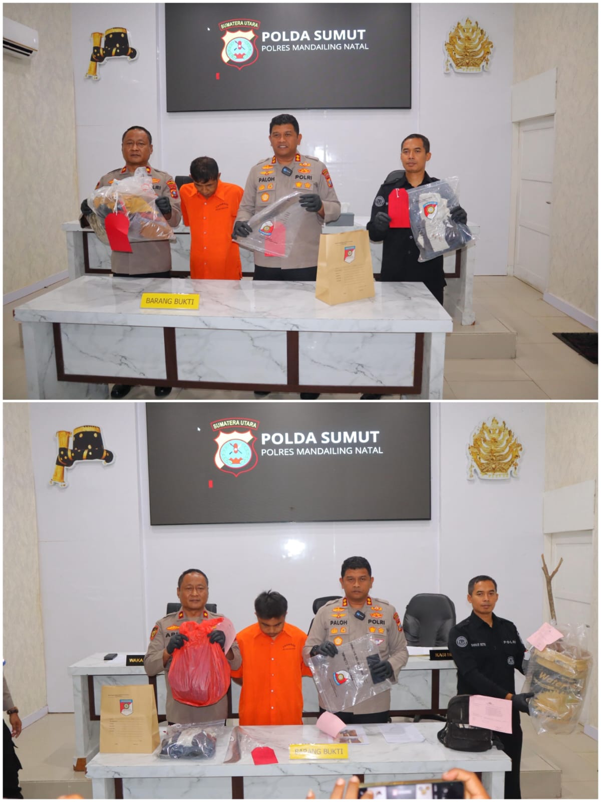 Kapolres Mandailing Natal (Madina) AKBP Arie Sofandi Paloh, SH, SIK memaparkan motif hingga ancaman hukuman yang dikenakan kepada dua orang pelaku pembunuhan yang terjadi di Kecamatan Pakantan dan Kecamatan Natal.