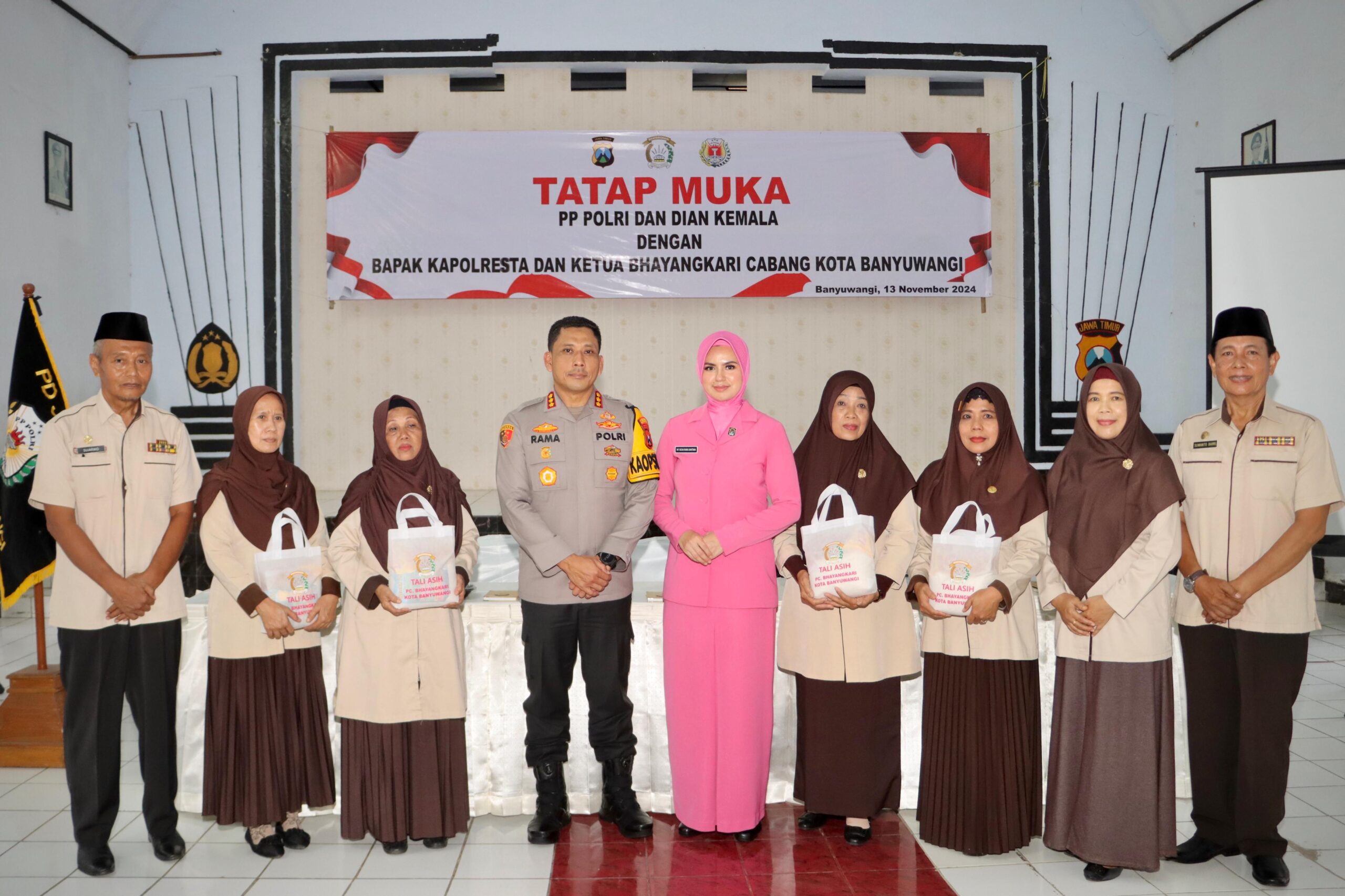 Banyuwangi, Metrozone.Net- Kepala Kepolisian Resor Kota Banyuwangi Kombes Pol. Rama Samtama PUtra, S.I.K., M.Si., M.H., beserta Ibu Ketua Bhyangkari Cabang Kota Banyuwangi Ny. Nova Rama Samtama Putra turut hadir dalam Tatap Muka PP Polri dan Dian Kemala Kabupaten Banyuwangi yang diselenggarakan di Gedung Bhayangkara. Rabu, (13/11/2024).