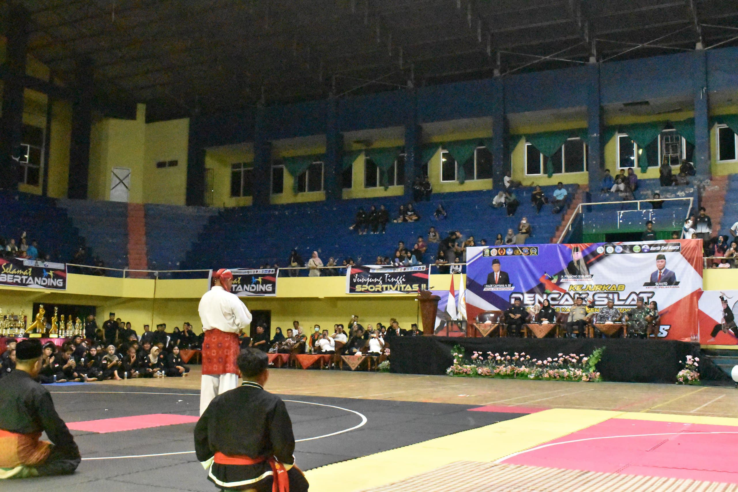 Banyuwangi, Metrozone.net- Kasdim 0825/Banyuwangi Mayor Kav Suprapto menegaskan komitmen TNI dalam mendukung pembinaan generasi muda melalui olahraga, saat menghadiri Opening Ceremony Kejuaraan Kabupaten (Kejurkab) Pencak Silat Antar Pelajar Banyuwangi Tahun 2025 di GOR Tawang Alun, Lingkungan Cuking, Mojopanggung, Kecamatan Giri, Jumat (26/12/2025) malam.
