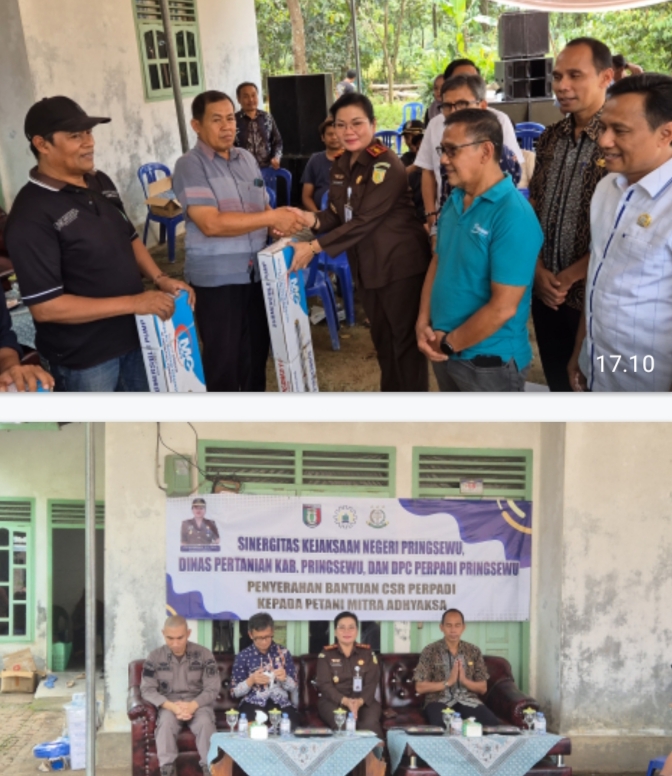 Kejaksaan Negeri Pringsewu bersama Dinas Pertanian Pringsewu memfasilitasi kegiatan penyerahan bantuan Corporate Social Responsibility (CSR) dari Persatuan Pengusaha Penggilingan Padi (Perpadi) Kabupaten Pringsewu kepada kelompok tani penerima manfaat dalam Program Petani Mitra Adhyaksa, yang dilaksanakan pada Kamis, 6 November 2025 sekira pukul 10.30 WIB di Pekon Tanjung Anom, Kecamatan Ambarawa, Kabupaten Pringsewu, Kamis (06/11/2025).