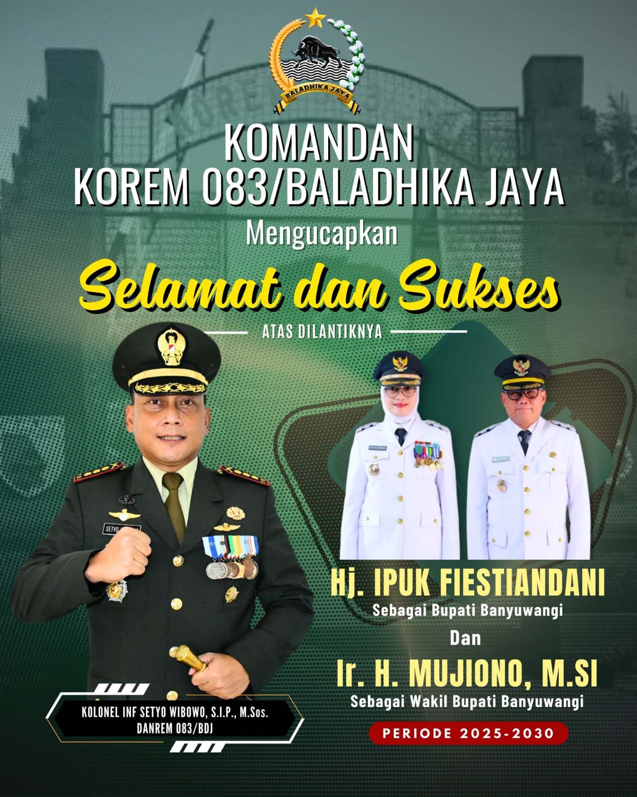 Banyuwangi, Metrozone.Net- Keluarga besar Kodim 0825 Banyuwangi dengan penuh rasa syukur dan kebanggaan mengucapkan selamat atas pelantikan Bupati dan Wakil Bupati Banyuwangi H. Hj. Ipuk Fiestiandani- H.Mujiono sebagai Bupati Banyuwangi terpilih untuk masa jabatan 2025-2030.