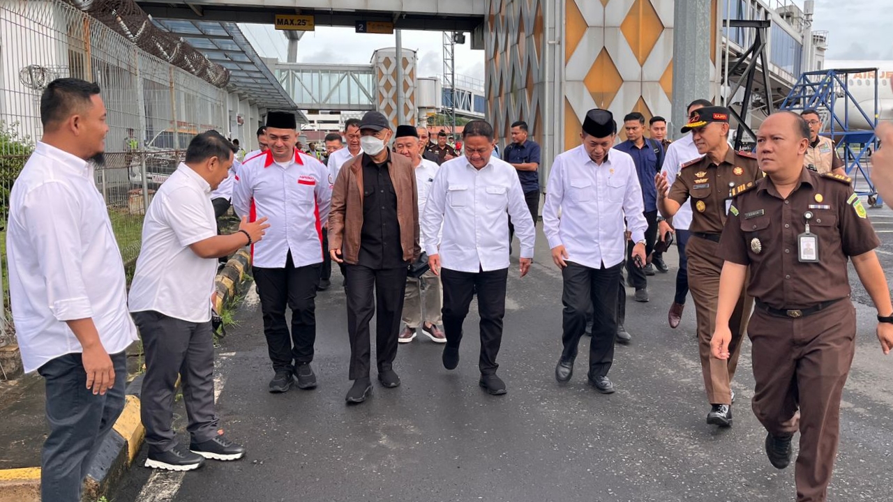 Kedatangan Menteri Koperasi-RI Dr. Ferry Joko Juliantono, S.E.,Ak.,M.Si. menggunakan pesawat Super Air Jet nomer penerbangan IU 800, bertempat di Bandara Radin Inten II, Desa Branti Raya Kec. Natar, Kab. Lampung Selatan. Dalam rangka menghadiri Penandatangan Perjanjian Kerja Sama (PKS) Ketua DPC ABPEDNAS se-Provinsi Lampung bertempat di Kantor Gubernur Lampung.