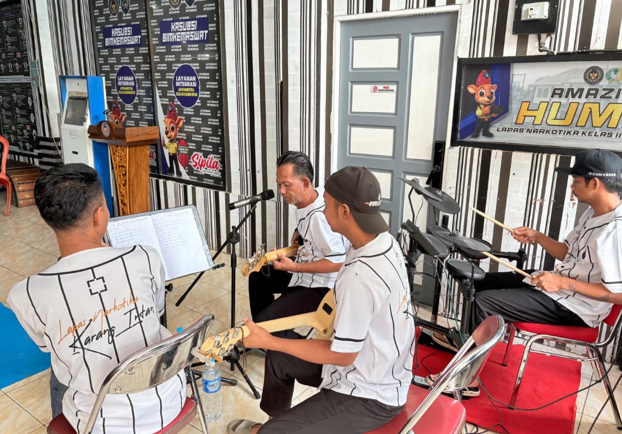 Suasana kunjungan Hari Raya Idulfitri ke-2 di Lembaga Pemasyarakatan (Lapas) Narkotika Kelas IIA Karang Intan, Minggu (22/03/2026), terasa semakin hangat dan penuh makna. Hal ini berkat penampilan Diamond Band, grup musik yang seluruh personelnya merupakan Warga Binaan Lapas Narkotika Karang Intan, yang sukses menghibur para pengunjung dan sesama Warga Binaan.
