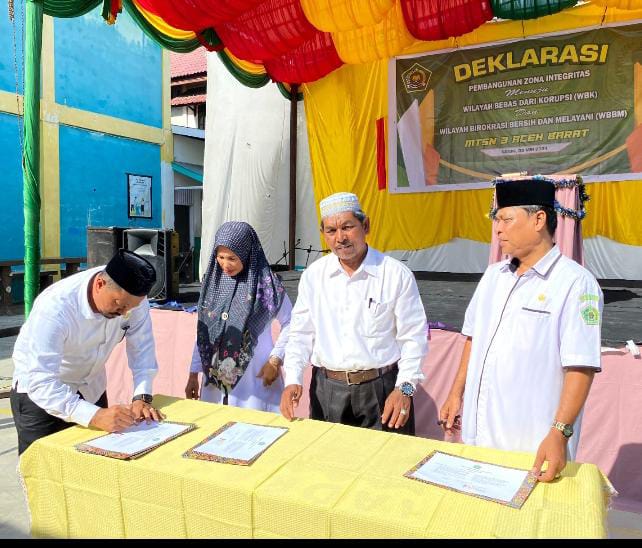 MEULABOH, Metrozone.net I Dalam rangka pencanangan Zona Integritas Menuju Wilayah Bebas dari Korupsi dan Wilayah Birokrasi Bersih dan Melayani (WBBM), MTsN 3 Aceh Barat menyelenggarakan deklarasi komitmen bersama pada Hari Senin, 6 Mei 2024 di kompleks madrasah.