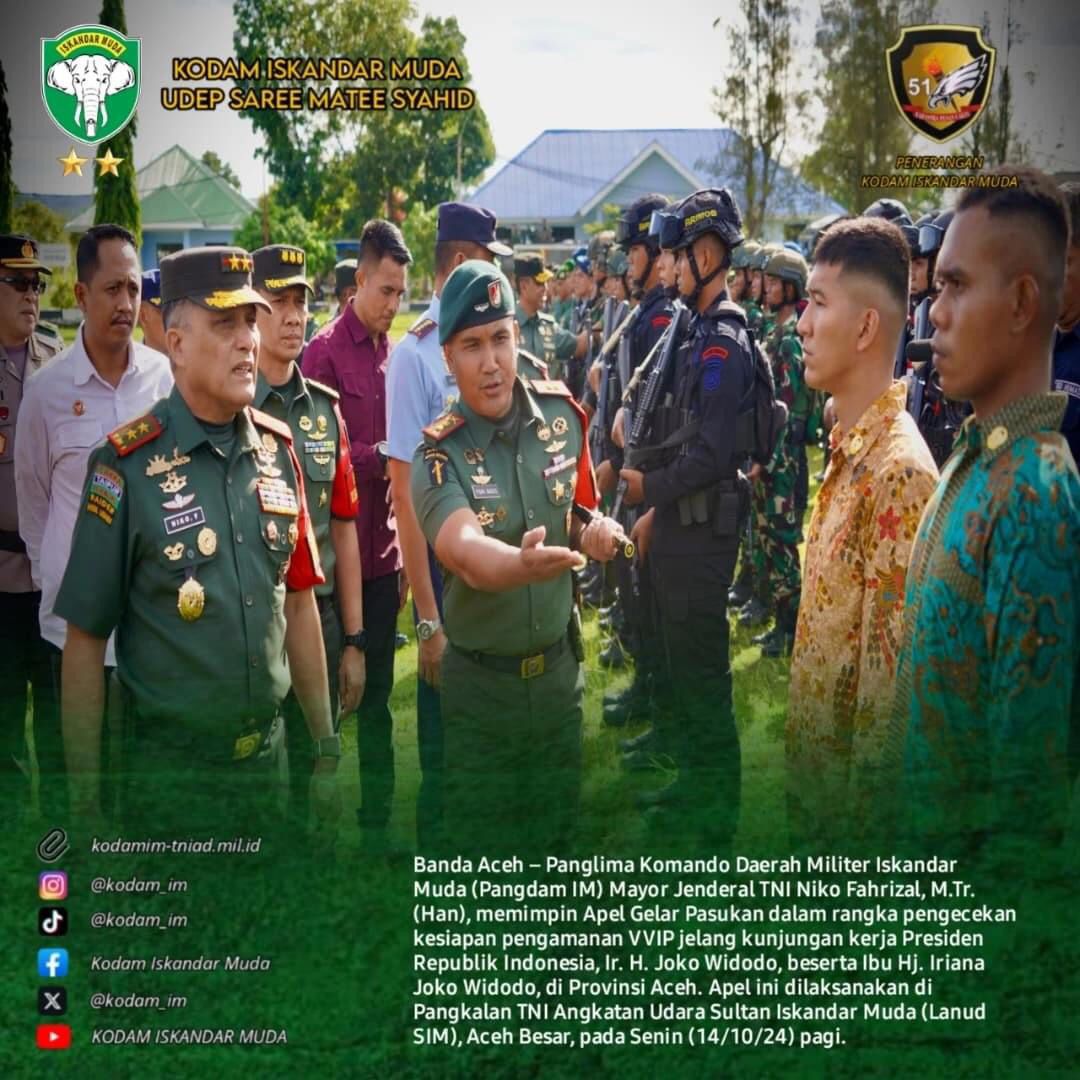 Banda Aceh,– Panglima Komando Daerah Militer Iskandar Muda (Pangdam IM) Mayor Jenderal TNI Niko Fahrizal, M.Tr. (Han), memimpin Apel Gelar Pasukan dalam rangka pengecekan kesiapan pengamanan VVIP jelang kunjungan kerja Presiden Republik Indonesia, Ir. H. Joko Widodo, beserta Ibu Hj. Iriana Joko Widodo, di Provinsi Aceh. Apel ini dilaksanakan di Pangkalan TNI Angkatan Udara Sultan Iskandar Muda (Lanud SIM), Aceh Besar, pada Senin (14/10/24) pagi.