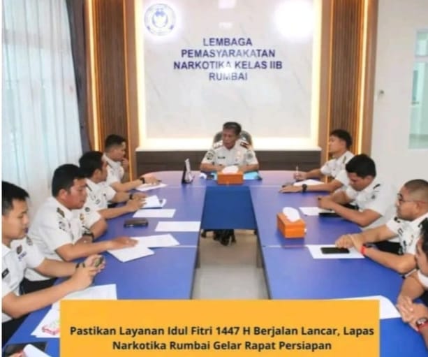 Pekanbaru, Metrozone.net- Lembaga Pemasyarakatan (Lapas) Narkotika Kelas IIB Rumbai menggelar rapat pembentukan tim ZI, mekanisme pelaksanaan layanan Hari Raya dan Pemberian Remisi Idul Fitri 1447 Hijriyah serta hal-hal penting lainnya, Senin (9/3). Rapat dipimpin langsung oleh Kepala Lapas dan diikuti seluruh Pejabat Struktural guna memastikan pelayanan berjalan tertib, aman, dan optimal.