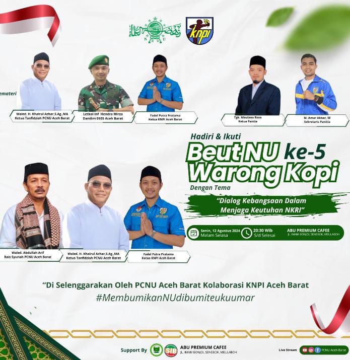 Ketua Panitia Pelaksana Tgk Maulana Roza mengatakan pada kegiatan Beut NU Warong Kopi ke-5 diselenggarakan oleh PCNU Aceh Barat berkolaborasi dengan KNPI Aceh Barat dengan thema “Dialog Kebangsaan Dalam Menjaga Keutuhan NKRI” akan diisi oleh pemateri Dandim 0105/Aceh Barat Letkol Inf Hendra Mirza, SE, M.Si, Ketua KNPI Aceh Barat Fadel Putra Pratama dan Ketua Tanfidziah PCNU Waled Khairul Azhar, S.Ag, MA.