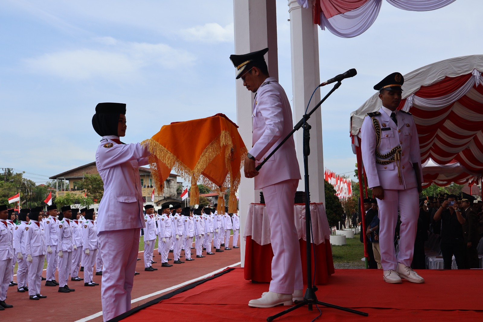 Upacara ini turut dihadiri oleh para pejabat pemerintah daerah, organisasi wanita, pelajar, tokoh masyarakat, serta para undangan yang tampak kompak mengenakan pakaian bernuansa merah putih. Nuansa patriotik dan haru mewarnai jalannya kegiatan.
