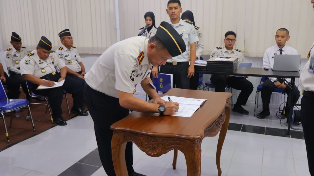Dalam rangka memperkuat komitmen kinerja Tahun 2026, Kepala Lembaga Pemasyarakatan (Lapas) Narkotika Kelas IIA Karang Intan, Yugo Indra Wicaksi, menandatangani Perjanjian Kinerja Tahun 2026 bersama Kepala Kantor Wilayah Direktorat Jenderal Pemasyarakatan (Ditjenpas) Kalimantan Selatan, Mulyadi. Kegiatan tersebut dilaksanakan di Aula Kantor Wilayah Ditjenpas Kalimantan Selatan, Rabu (7/1).