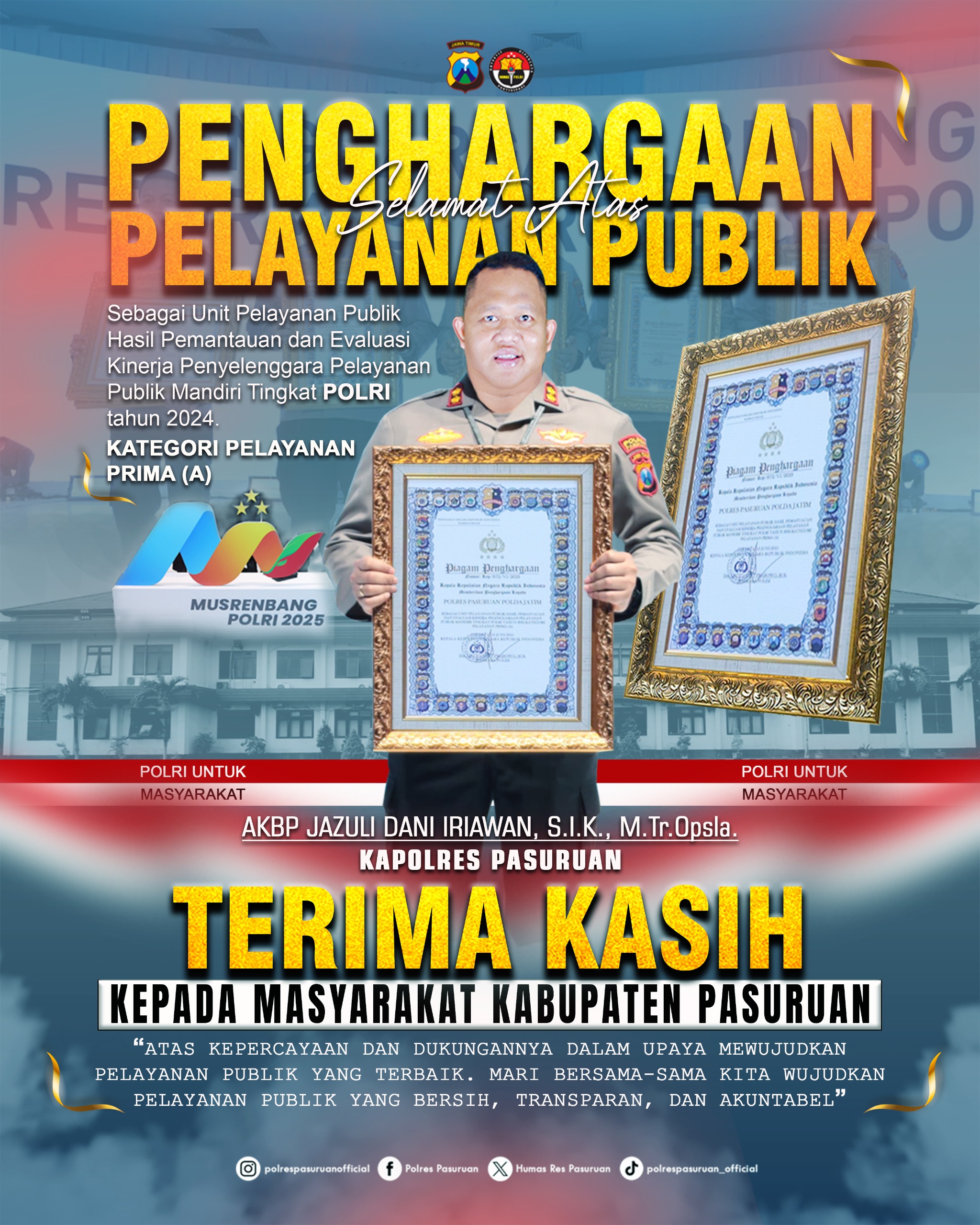 Kapolres Pasuruan AKBP Jazuli Dani Iriawan menyampaikan rasa syukur dan bangga atas capaian tersebut. Ia menyebut penghargaan ini sebagai hasil kerja keras seluruh personel Polres Pasuruan dalam memberikan pelayanan terbaik kepada masyarakat. “Penghargaan ini menjadi bukti bahwa kami terus berkomitmen menghadirkan pelayanan yang profesional, transparan, dan berintegritas. Ini bukan akhir, tapi justru semangat untuk terus berbenah dan melayani masyarakat dengan lebih baik lagi,” ujar AKBP Jazuli Dani Iriawan usai menerima penghargaan.