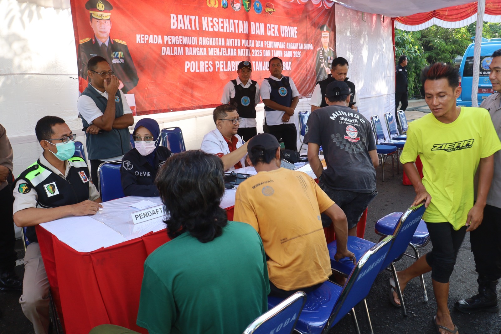Aparat kepolisian berkolaborasi dengan BNNK Surabaya menggelar kegiatan Bakti Kesehatan dan Tes Urine bagi para pengemudi angkutan umum, angkutan antar pulau, serta ojek online (Ojol) yang melintas di kawasan Gate Pelabuhan Jamrud, Jalan Perak Timur.