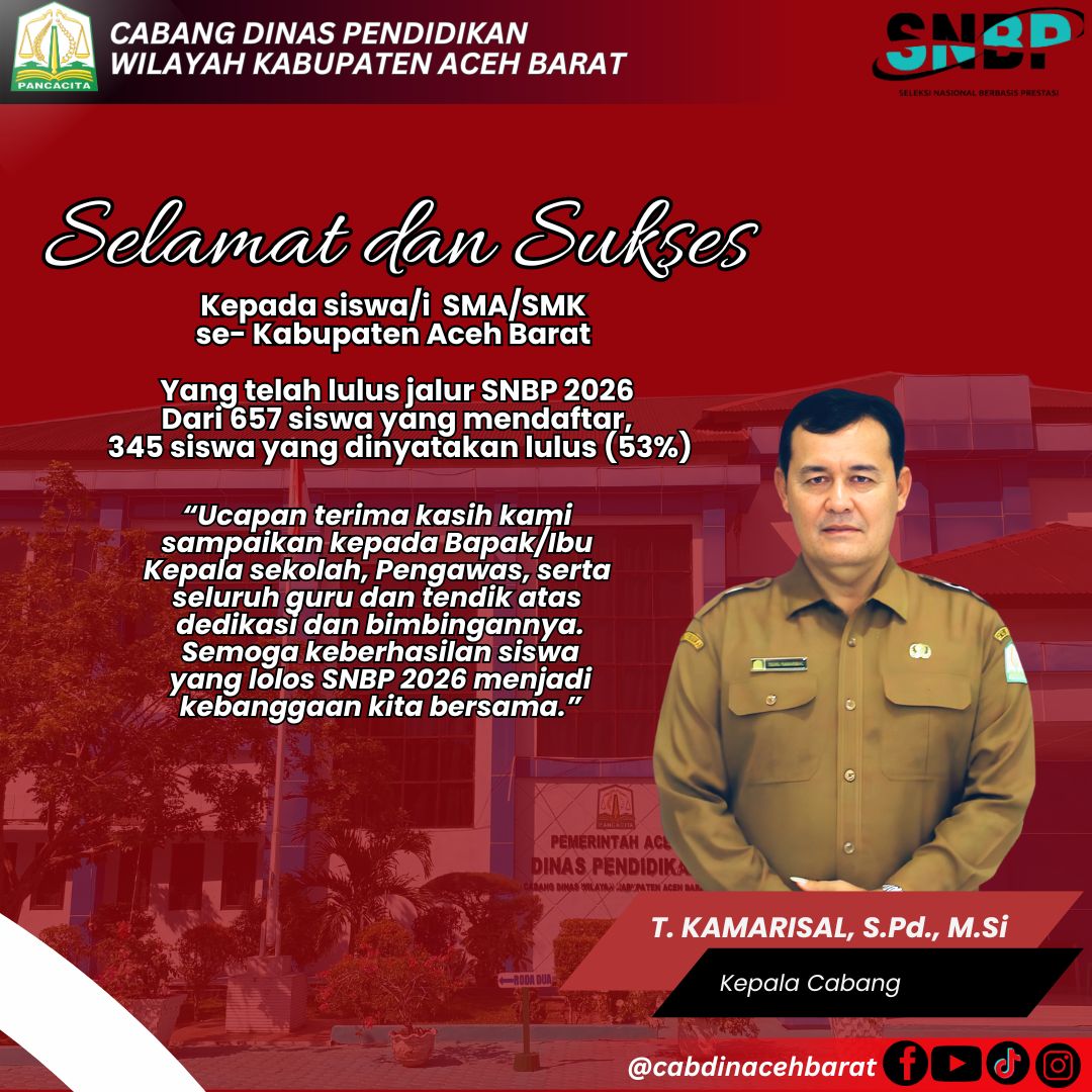 ”Terima kasih kepada bapak/ibu kepala sekolah, pengawas, serta seluruh guru atas dedikasi dan bimbingannya yang tulus. Keberhasilan siswa dan siswi yang lolos SNBP 2026 ini bukan sekadar angka, melainkan menjadi kebanggaan kita bersama bagi masyarakat Aceh Barat,” ungkap T. Kamarisal