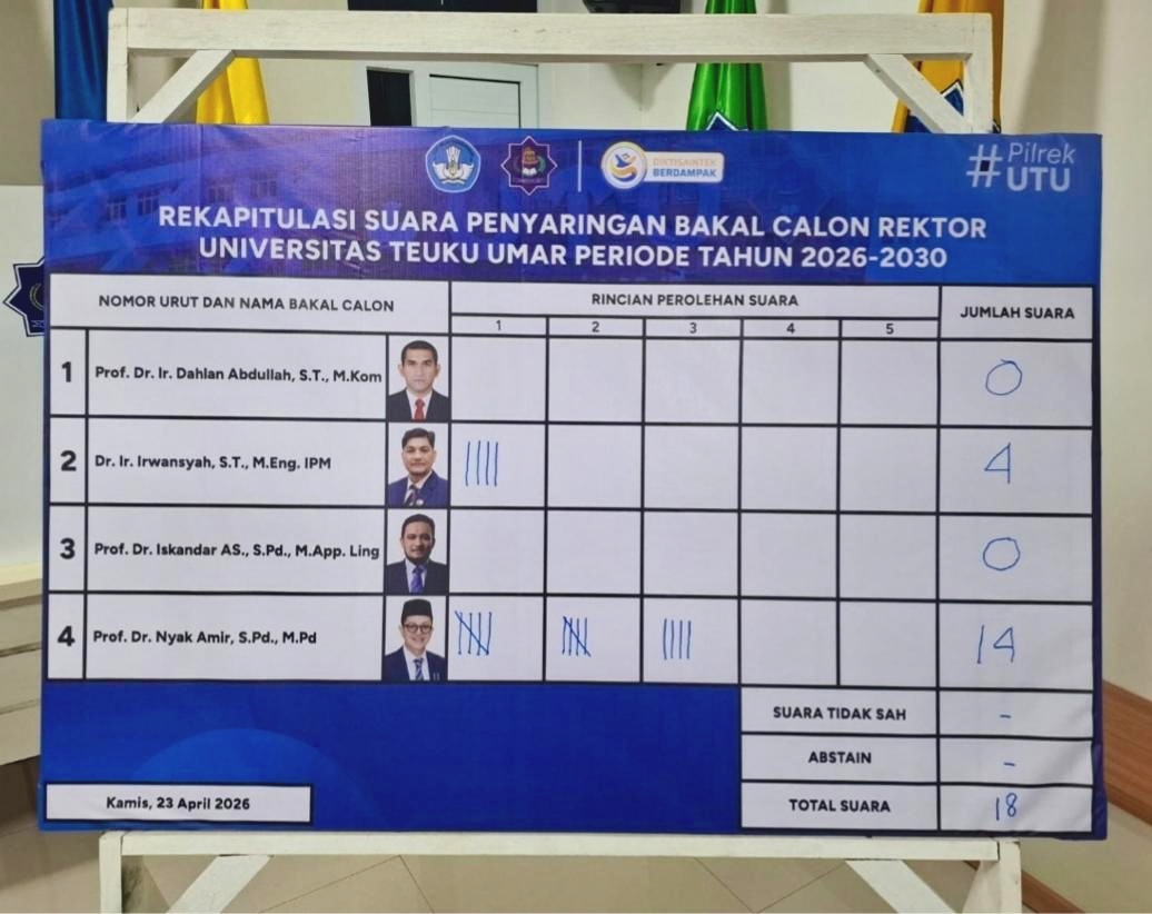 Dari total 18 suara yang diperebutkan, Prof. Nyak Amir berhasil mengantongi 14 suara, unggul jauh di atas empat kandidat lainnya. Posisi kedua ditempati oleh Dr. Irwansyah, Dekan Fakultas Teknik UTU saat ini, dengan perolehan 4 suara.