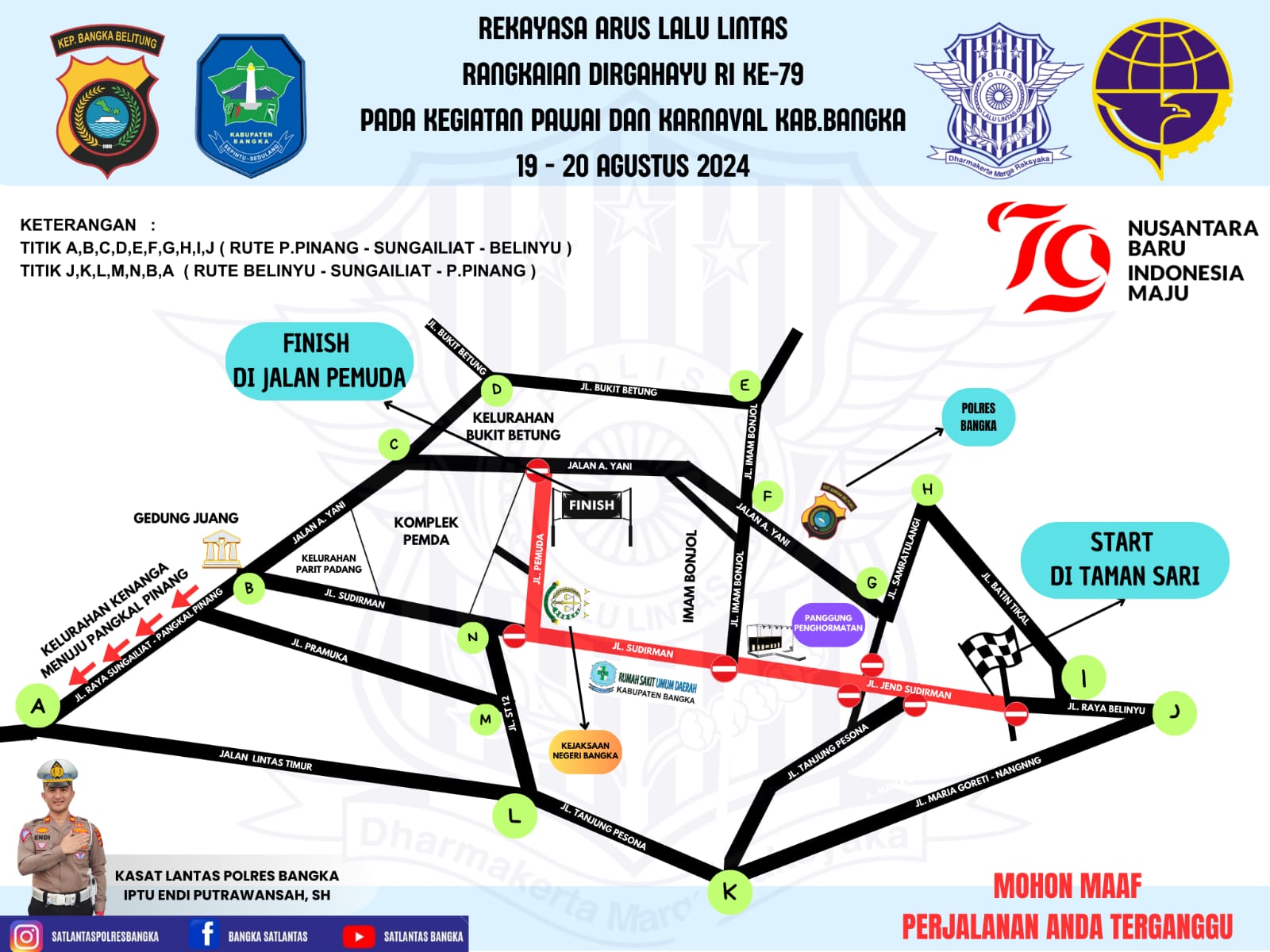 Kasat Lantas Polres Bangka, Iptu Endi Putrawansah, S.H., menjelaskan bahwa rekayasa lalu lintas dilakukan untuk menghindari kemacetan dan memastikan kelancaran acara. Rute pawai akan dimulai dari Jalan Jenderal Sudirman, Taman Sari Sungailiat, menuju Simpang Kejaksaan. Kemudian, peserta pawai akan berbelok kanan ke Jalan Pemuda dan berakhir di Jalan Ahmad Yani, Sungailiat.