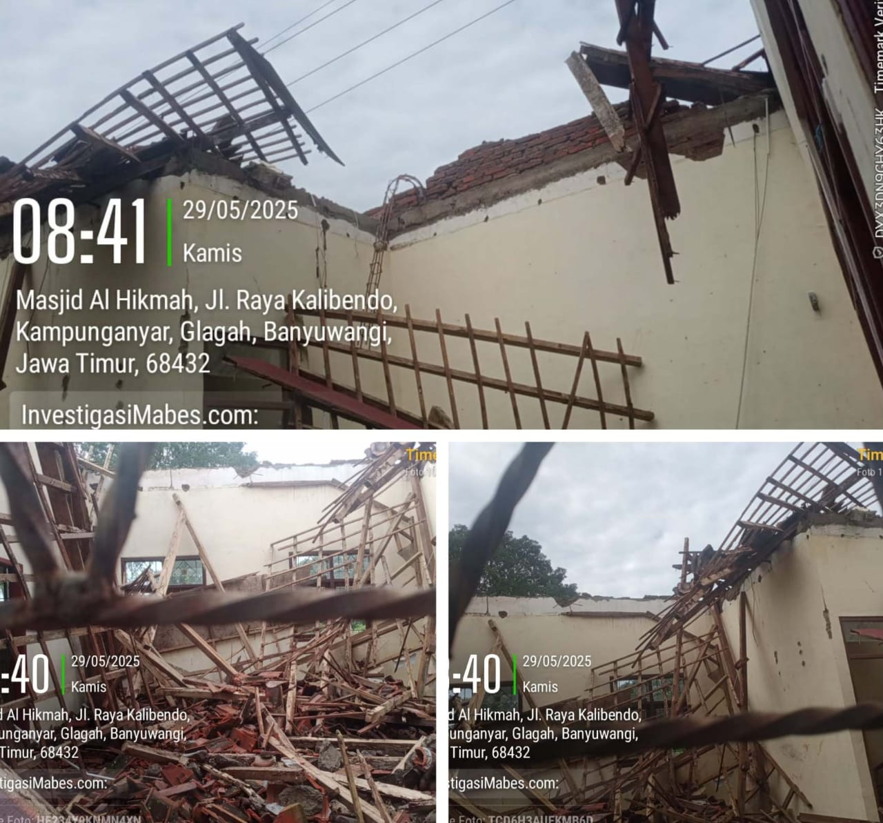 Runtuhnya bangunan ruang guru yang berada dalam kompleks Masjid Al Hikmah, Jl. Raya Kalibendo, Kampunganyar, Glagah, Banyuwangi ini terjadi pada 15 Mei 2025. Berdasarkan pantauan langsung tim awak media pada Kamis, 29 Mei 2025 pukul 08.40 WIB, kondisi reruntuhan masih dibiarkan berserakan, menyisakan kerangka kayu lapuk dan puing-puing genteng berserakan yang membahayakan keselamatan.