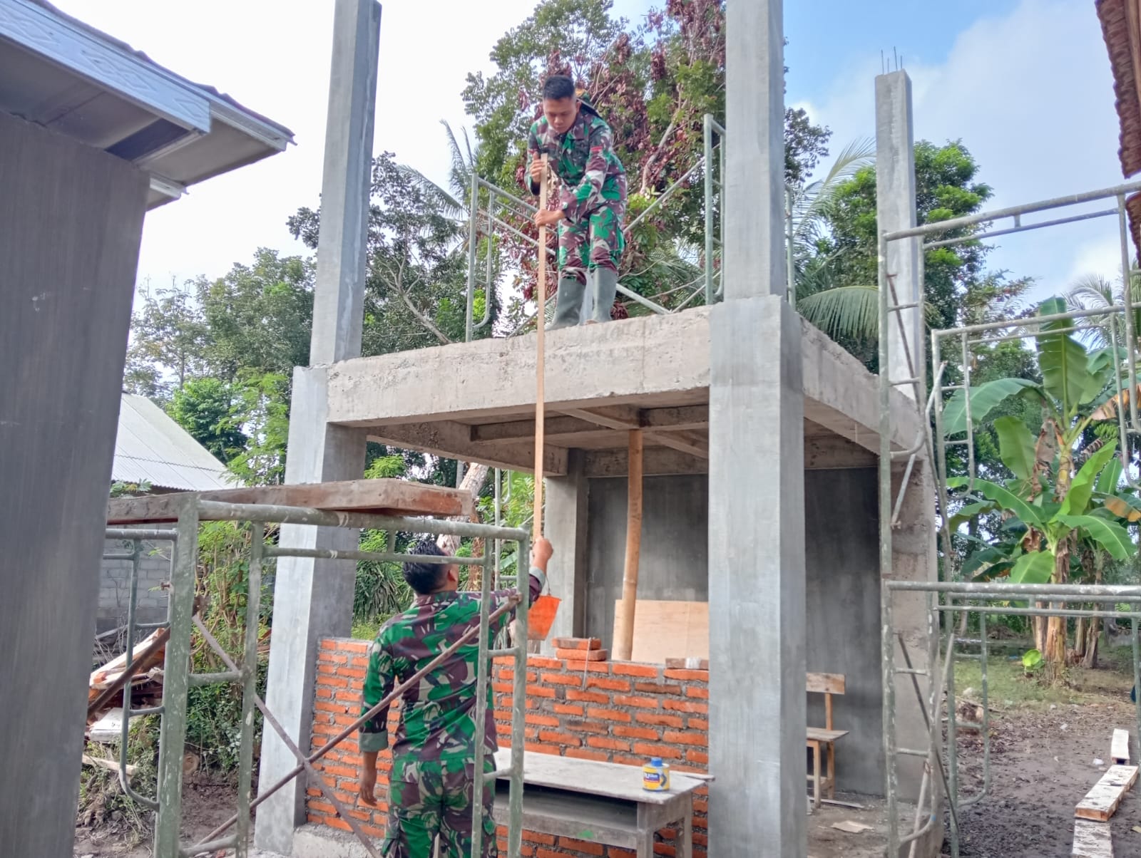 Anggota Satgas TMMD bersama masyarakat setempat bergotong royong melanjutkan pembangunan fisik berupa dinding penampungan air menggunakan material bata merah dan keramik pelapis. Progres pembangunan menunjukkan hasil yang positif dan terus dikebut guna mendukung kebutuhan air bersih warga sekitar.