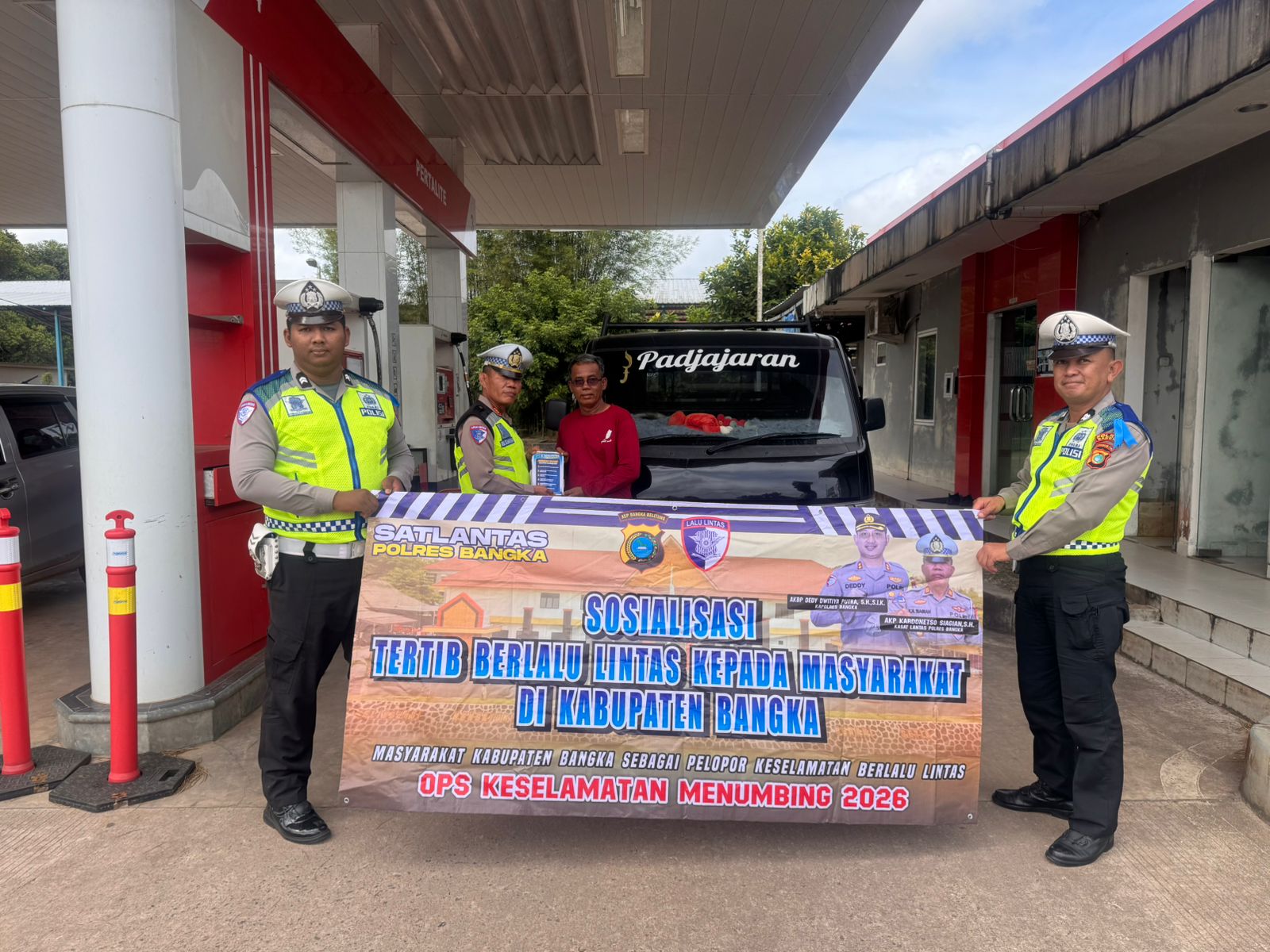 Bangka – Dalam rangka mendukung pelaksanaan Operasi Keselamatan Menumbing Tahun 2026, personel Satuan Lalu Lintas (Satlantas) Polres Bangka melaksanakan kegiatan himbauan dan peneguran kepada pengguna jalan, disertai pembagian brosur serta penempelan stiker keselamatan lalu lintas.Kegiatan tersebut dilaksanakan diwilayah hukum Polres Bangka. Minggu (8/2/2026).
