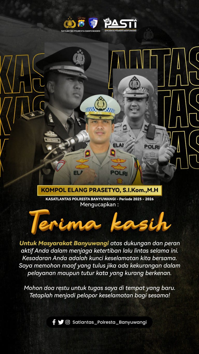 Banyuwangi, Metrozone.net– Satuan Lalu Lintas (Satlantas) Polresta Banyuwangi menyampaikan ucapan terima kasih dan apresiasi setinggi-tingginya kepada Kompol Elang Prasetyo, S.I.Kom., M.H., atas dedikasi, pengabdian, serta kepemimpinannya selama menjabat sebagai Kepala Satuan Lalu Lintas (Kasat Lantas) Polresta Banyuwangi. Ungkapan tersebut menjadi bentuk penghormatan atas berbagai capaian dan kontribusi nyata yang telah ditorehkan demi peningkatan pelayanan dan keselamatan berlalu lintas di wilayah Kabupaten Banyuwangi.