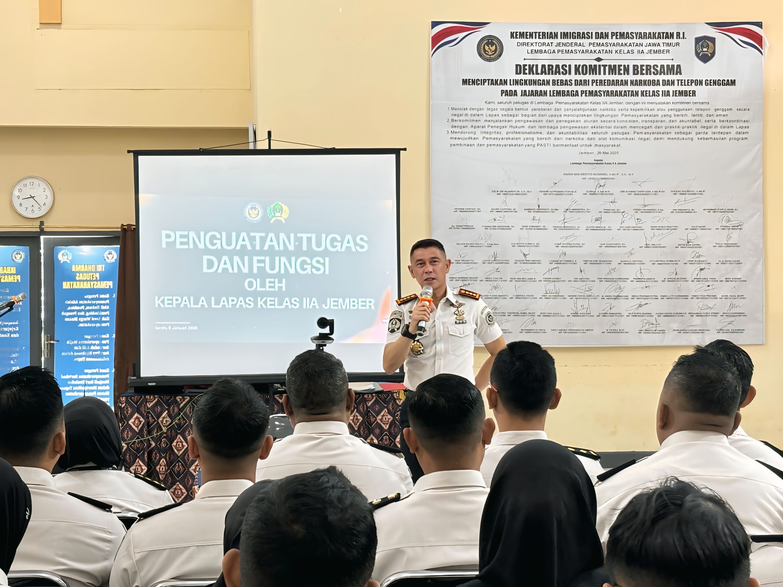 Jember, Metrozone.net- Kepala Lembaga Pemasyarakatan (Kalapas) Kelas IIA Jember, RM. Kristyo Nugroho, memberikan Penguatan Tugas Pokok dan Fungsi Pemasyarakatan kepada seluruh pegawai dan CPNS Lapas Jember. Kegiatan yang dilaksanakan di Aula Utama Lapas Jember ini bertujuan untuk memperkuat kembali komitmen dan tanggung jawab setiap petugas dalam menjalankan peran dan fungsi Pemasyarakatan, pada Kamis (08/01/2026).