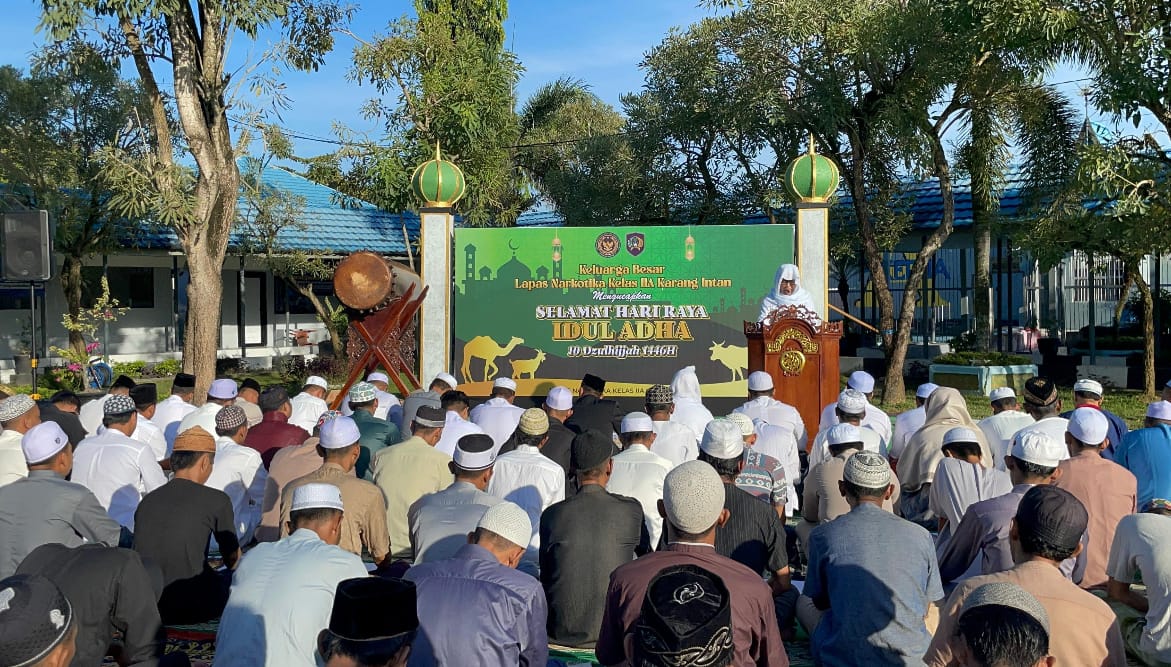 Gema takbir berkumandang mengisi setiap penjuru Lembaga Pemasyarakatan (Lapas) Narkotika Kelas IIA Karang Intan, menyambut datangnya Hari Raya Idul Adha 1446 H / 2025 M. Ratusan Warga Binaan Pemasyarakatan (WBP) memadati Lapangan Upacara dalam Lapas untuk mengikuti pelaksanaan Salat Idul Adha, Jumat (6/6).